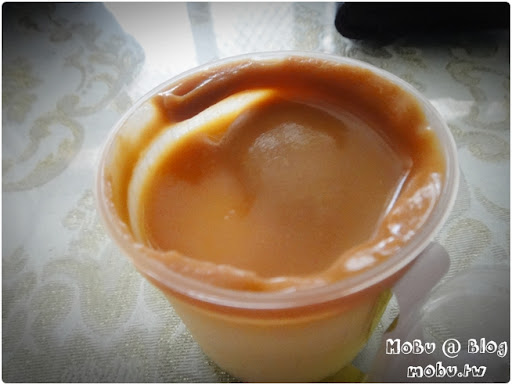 布丁的側面圖。 焦糖與布丁本體有著強烈的分明對比。裝的杯子的材質是還蠻硬的塑膠瓶。